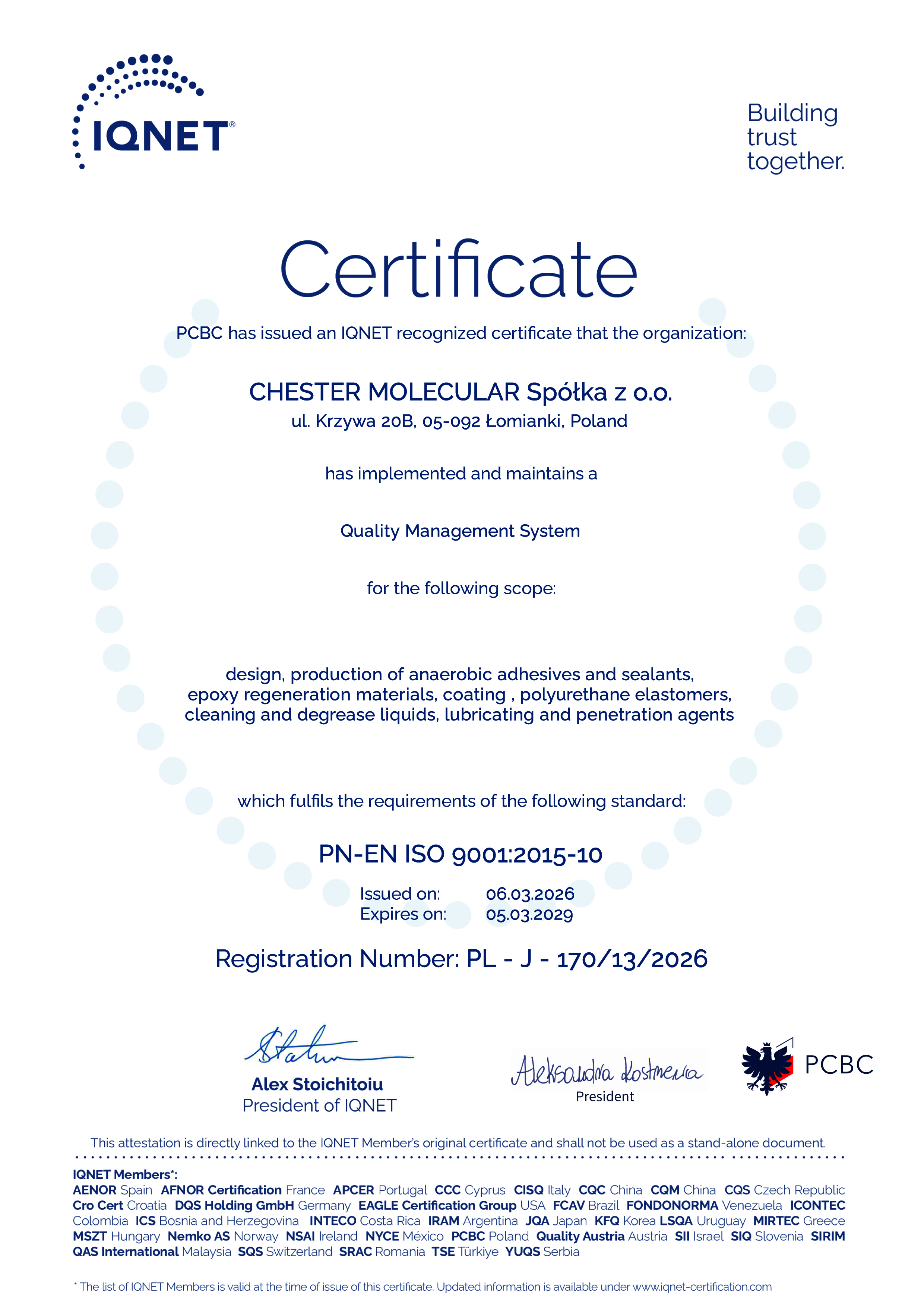 - Certyfikat Systemu Jakości PN-EN ISO 9001:2015-10
